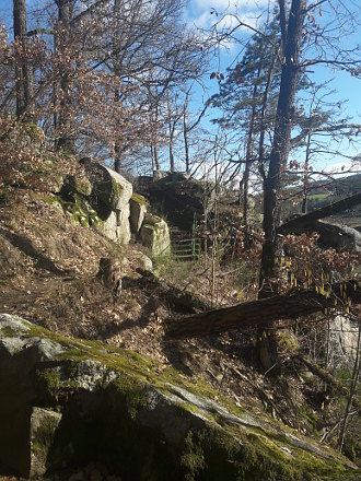 Wir steigen also auf Waldboden nach oben, befinden uns auch mal auf einer gebauten Treppe und bestaunen linksseitig die Felsengiganten. Rechts unter uns hat der Stausee durch die Absenkung den Verlauf der Schwarzach frei gelegt.